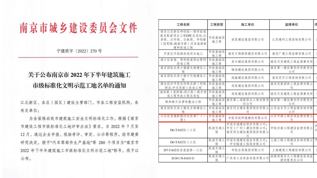 近日,南京市城鄉建設委員會發布了《關于公示南京市2022年下半年建筑施工市級標準化文明示范工地名單的通知》,公司承建的南京市六合區龍袍新城污水廠(一期)榮獲南京市2022年下半年建筑施工市級標準化文明示范工地。...