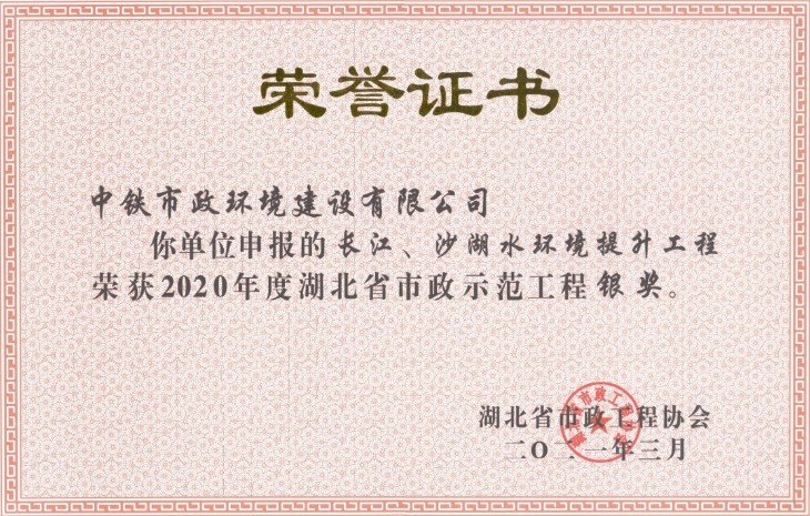 長江、沙湖水環境提升工程是國家“長江大保護”戰略部署以及武漢水環境治理重要一環,也是湖北省內首次實施的最大直徑頂管工程。項目曾榮獲2018年度”武漢控股建設事業部項目精細化活動優秀施工單位”、2019年度”湖北省建筑工程安全文明施工現場”、榮獲2020年度“武漢市市政工程金獎”多項榮譽,此次獲獎,為公司在湖北省的滾動發展增添了動力,更是項目部全體職工對公司跨越發展的隆重獻禮。